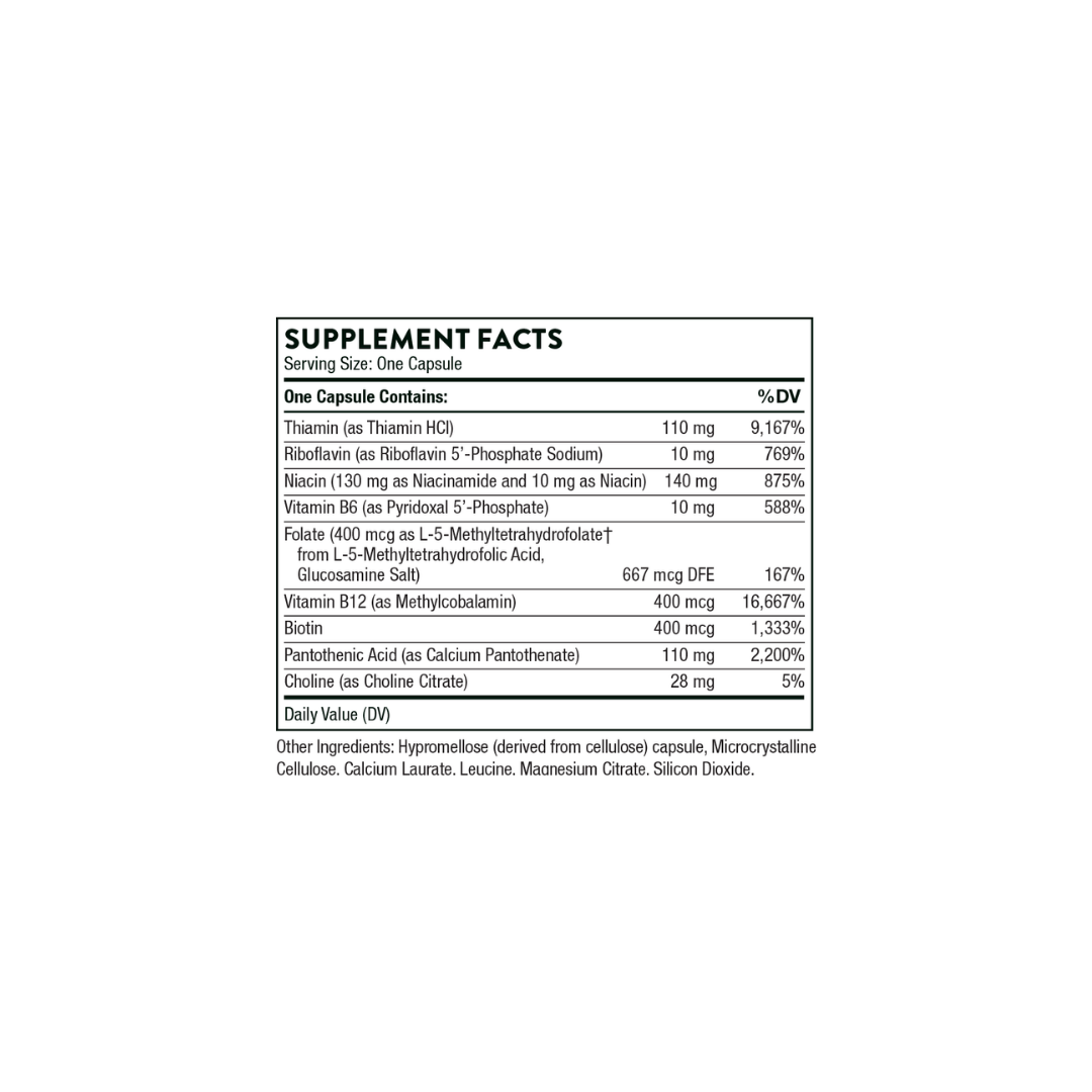Thorne’s Basic B Complex formula contains the active forms of the B vitamins, making it easy for your body to absorb them. This comprehensive blend provides multiple benefits to support your lifestyle, such as helping convert food into fuel and enhancing cellular energy.* Because most B vitamins don’t remain in the body, they must be acquired from diet and supplementation to help maintain optimal health.*