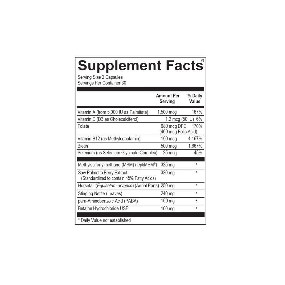 Cosmedix provides several essential vitamins, minerals and phytonutrients needed to support healthy skin, hair and nails. Cosmedix provides betaine HCl, which helps to promote efficient digestion and assimilation of proteins and minerals necessary for hair and nail health. It includes MSM, which provides a bioavailable source of sulfur, for connective tissue integrity. Saw palmetto is added to support normal levels of DHT, known to play a role in the thickness and health of hair. In addition, silica (from horsetail grass extract) is included for its collagen-enhancing properties. Each serving of Cosmedix contains 100 mg betaine HCl, 320 mg of saw palmetto and 325 mg MSM. Added support from vitamin A, vitamin D3, folic acid, vitamin B12, biotin and selenium provide a full spectrum of skin, hair and nail support.