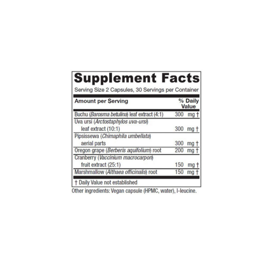 Scientific research and traditional herbal medicine are integrated to provide this unique formula. Cranberry has been documented in promoting healthy bladder wall tissue. Oregon grape, marshmallow, buchu, pipsissewa, and uva ursi combine to form an effective and reliable formula for a healthy bladder and urinary tract.*