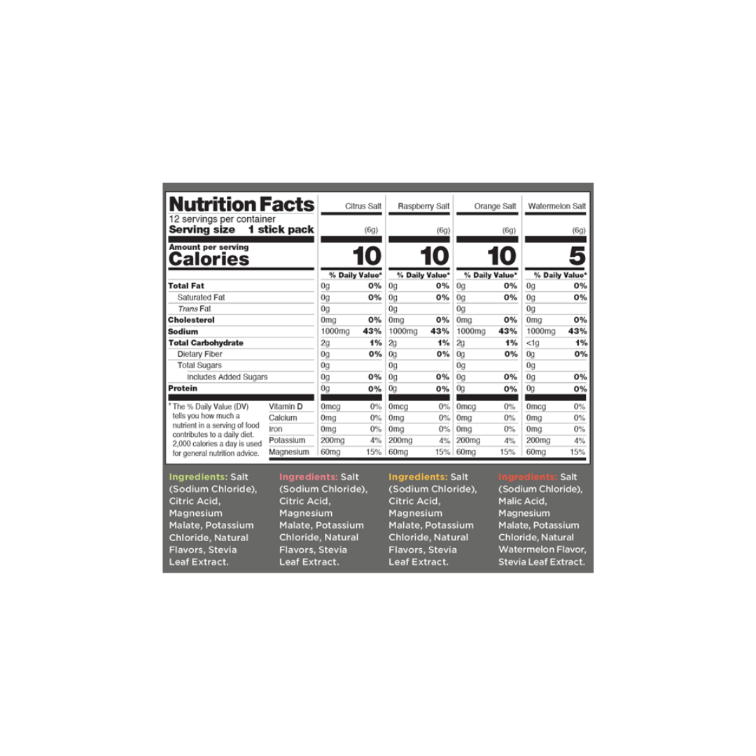 Each stick pack contains 1000mg sodium, 200mg potassium, and 60mg of magnesium to support lifestyles and conditions that require electrolyte supplementation.
