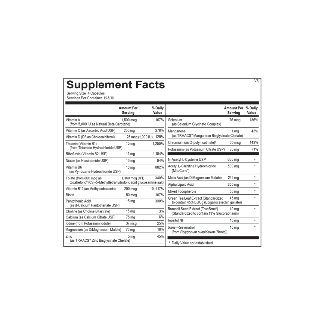 This formula includes EGCG from green tea, resveratrol, NAC, and broccoli seed extract (a natural source of sulforaphane), all chosen to help protect against oxidative stress and promote healthy cellular function.