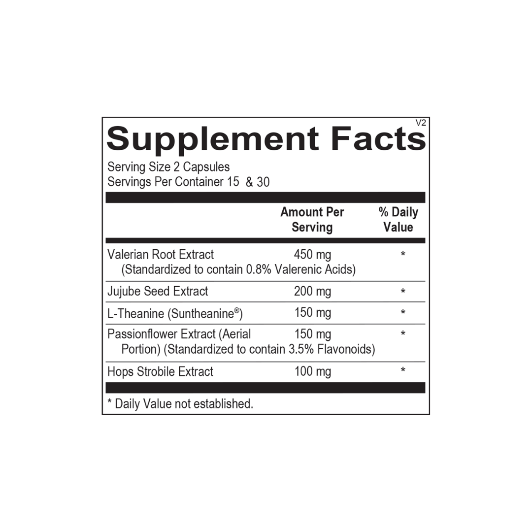 Neuro Rest PM includes valerian root, a well-known herb used to help with sleep-related issues and to produce a state of relaxation. Passionflower and jujube have been traditionally used to induce relaxation in those experiencing overstimulation and scattered thoughts. L-theanine, an amino acid found in green tea, supports resilience to stress by increasing alpha brain wave activity. Two capsules of Neuro Rest PM include 450 mg valerian root extract, 200 mg jujube seed extract, 150 mg passionflower extract, 150 mg L-theanine and 100 mg hops strobile extract.