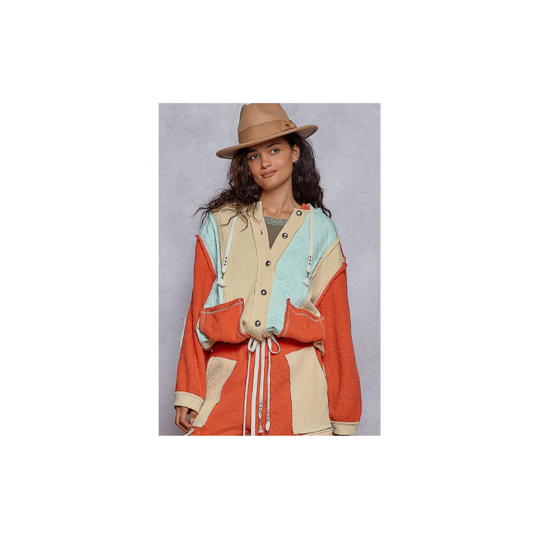 Designed in button down oversized fit jacket with hoodie featured in thermal, quilted knit and cut and sew sweater knit.