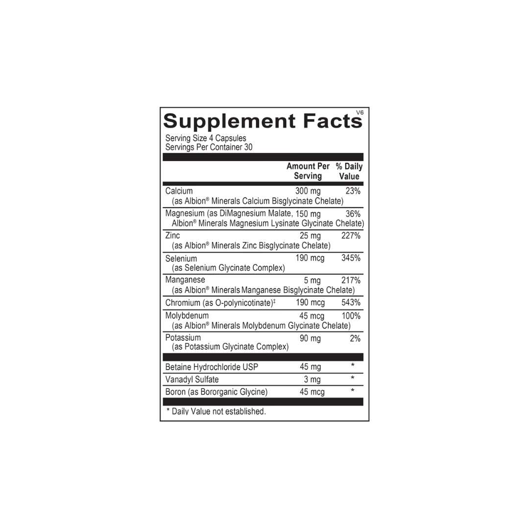 Reacted MultiMin provides an ideal balance of highly-absorbed minerals combined with the benefits of betaine HCl to prime digestion and improve the absorption of vitamins and minerals. Reacted MultiMin provides mineral amino acid chelates in optimal ratios to help the body maintain mineral balance and avoid competition between minerals for absorption.