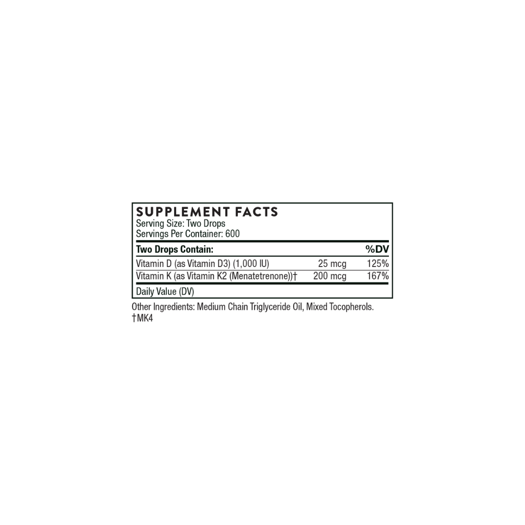 Vitamin D + K2 Liquid promotes bone health, healthy immune function, and cardiovascular health.* The combination of vitamin D3 and K2 provides greater benefits together than either does individually.